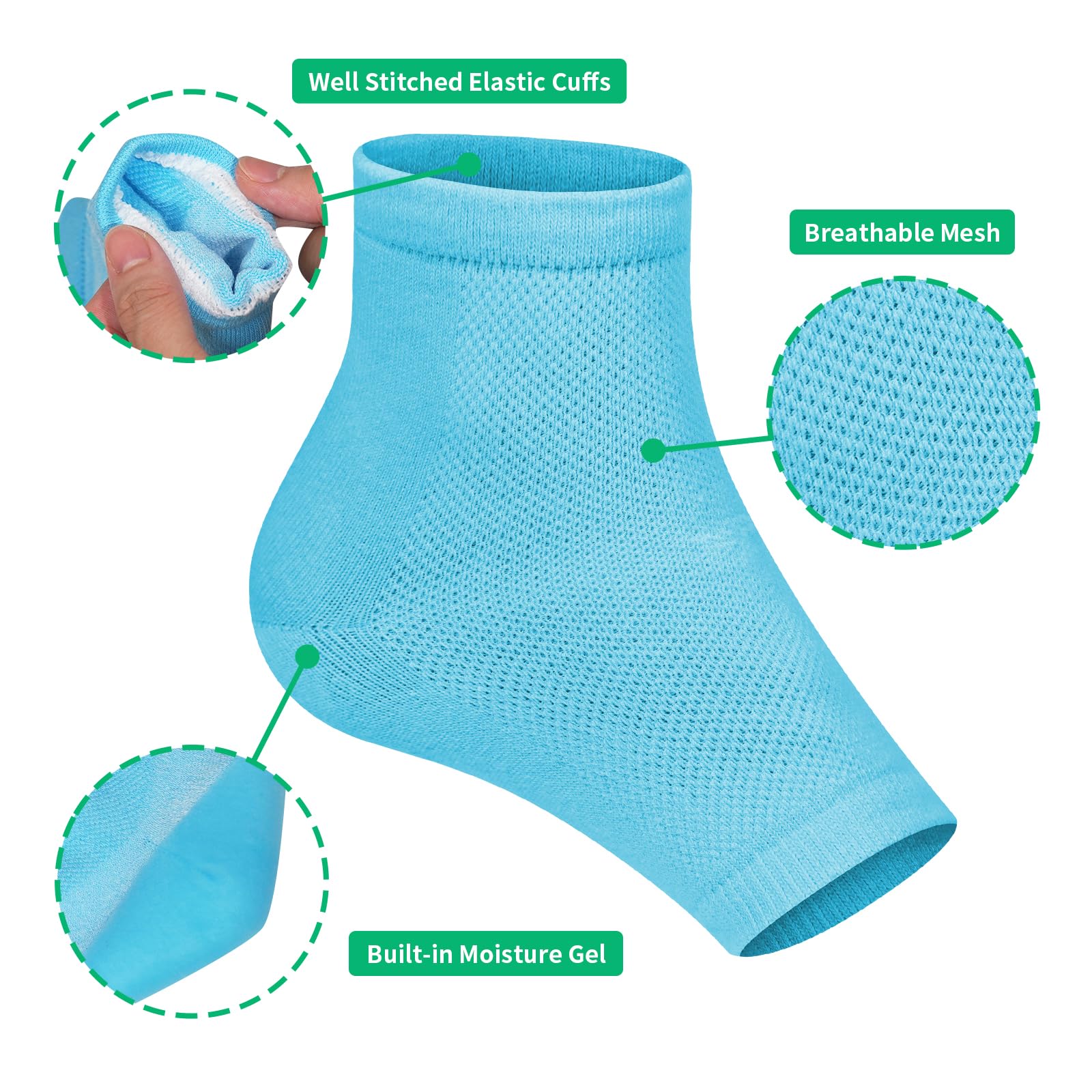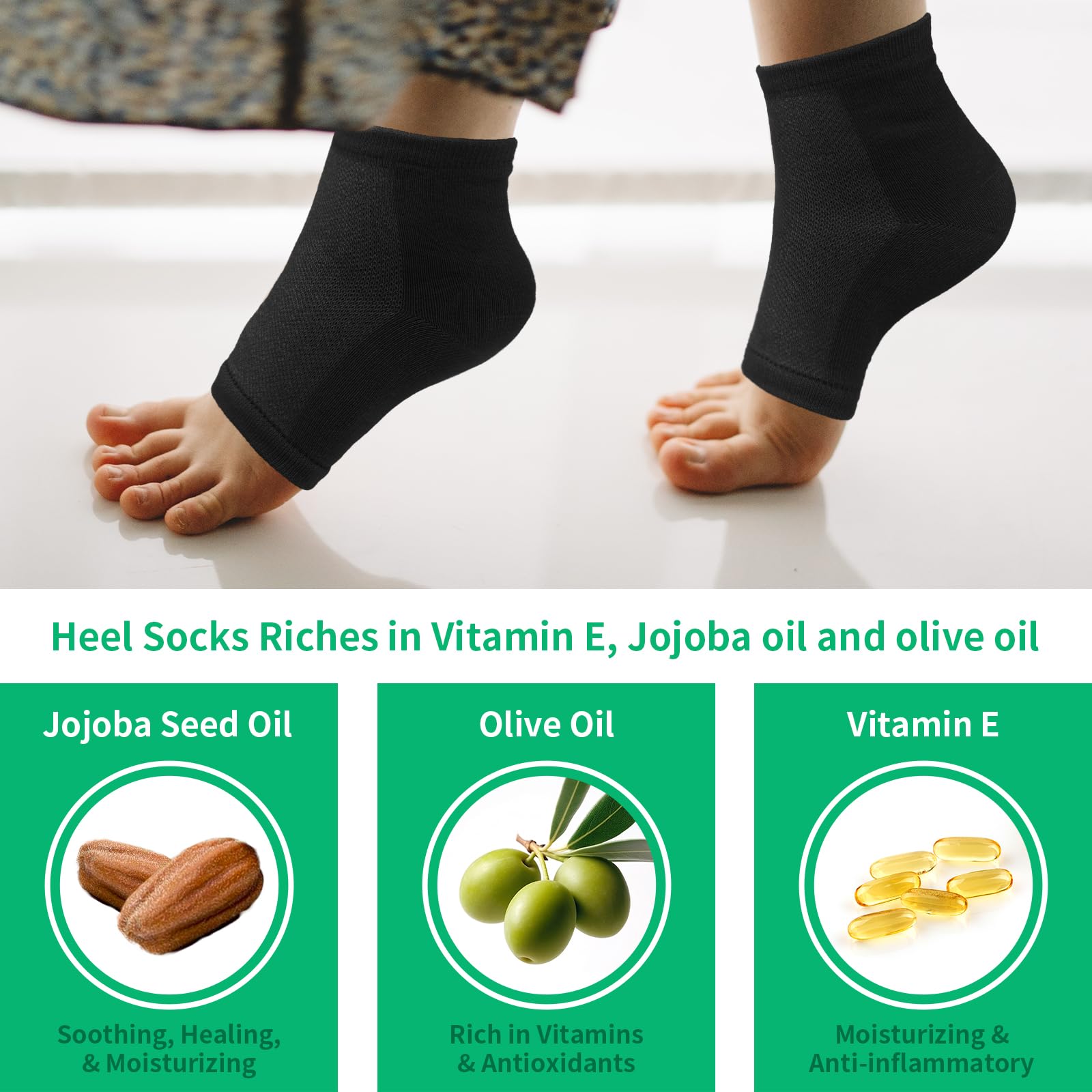 Built-in Gel for Softening Heels - The heel socks are attached with moisturizing gel. While wearing them, the gel continuously releases vitamin E, essential oil, jojoba oil, and olive oil to treat, nourish, and soften rough, cracked, and dry skin. These moisturizing gel heel socks act as heel softeners for cracked heels and can also prevent friction, similar to heel protectors. They are great for reducing friction between the shoe and foot, providing blister prevention for heels.