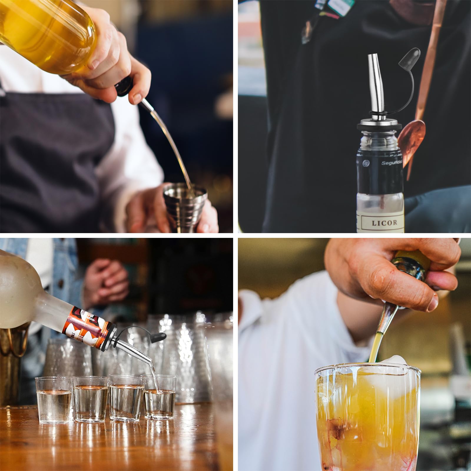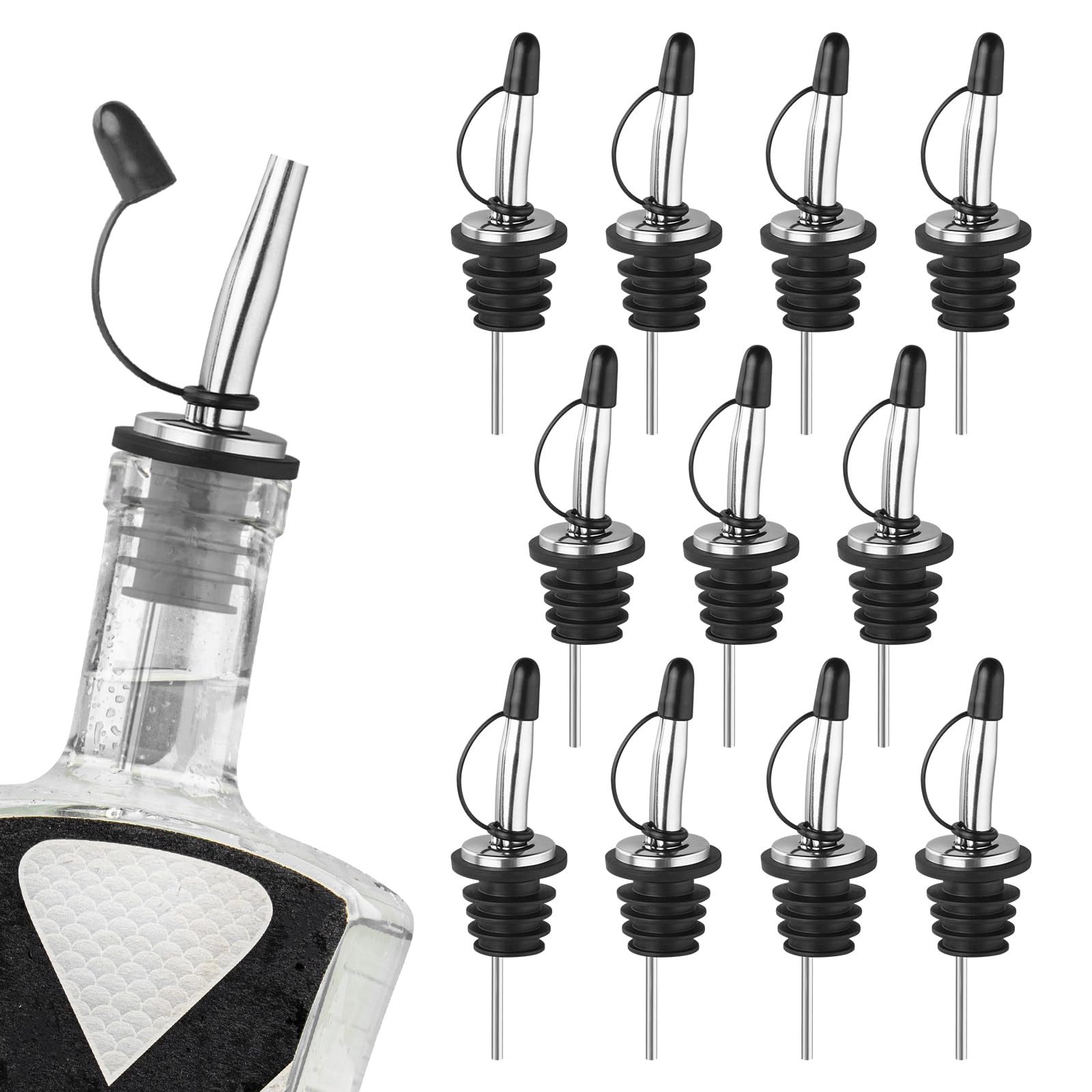 If you are tired of olive oil dripping down the bottle and causing a mess on your counter, and if you want to mix drinks like a professional bartender without dribbling ingredients all over the counter, then look no further than the Ohtomber 12-pack of stainless steel liquor pourer bottle toppers! These pour spouts are made of high-quality stainless steel, ensuring they are rust-proof and food-grade. Whether you run a pub, club, restaurant, bar, coffee shop, or diner, these liquor pour spouts will definitely come in handy. These bartender accessories pour spout for liquor bottles fit different liquor bottles, such as snow cone syrup bottles, olive oil spouts, vinegar spouts, and wine spouts, so you'll never have to worry about compatibility issues.Tapered Design for Control and AccuracyThe tapered design of these pour spouts allows for control and accuracy during pouring, preventing the liquor from creating a sticky mess down the side of the bottle. These liquor pour spout are easy to use and put an end to sloppy pouring.Perfectly Consistent Pour SpeedThese speed pour spouts provide a perfectly consistent pour speed, thanks to their special backflow hole that prevents leakage. You can confidently grasp the pouring speed every time.Provides the perfect sealing for your pourersWith 5 layers of rubber, these oil pourers provide the perfect sealing to prevent any leakage. You can easily control the pouring with just one hand without worrying about slip-down.Long cap dust-proof designThe long cap design of these liquor bottle pourers not only covers the backflow hole but also protects your liquor from dust, debris and fruit flies. -