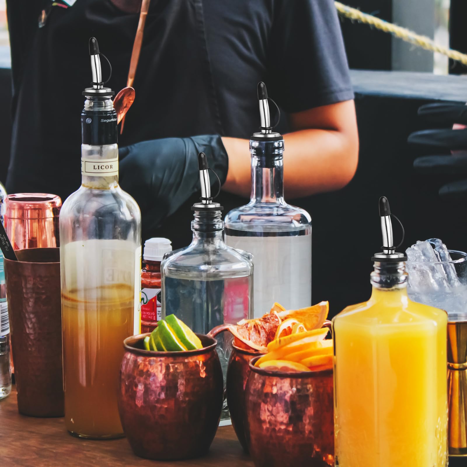 High-Quality Material of the Pour Spouts - These liquor pour spouts are made of non-rusting stainless steel, ensuring safety and durability. The pour spout for liquor bottles features five layers of food-grade silicone plugs, which effectively prevent leakage, good as home bar accessories.