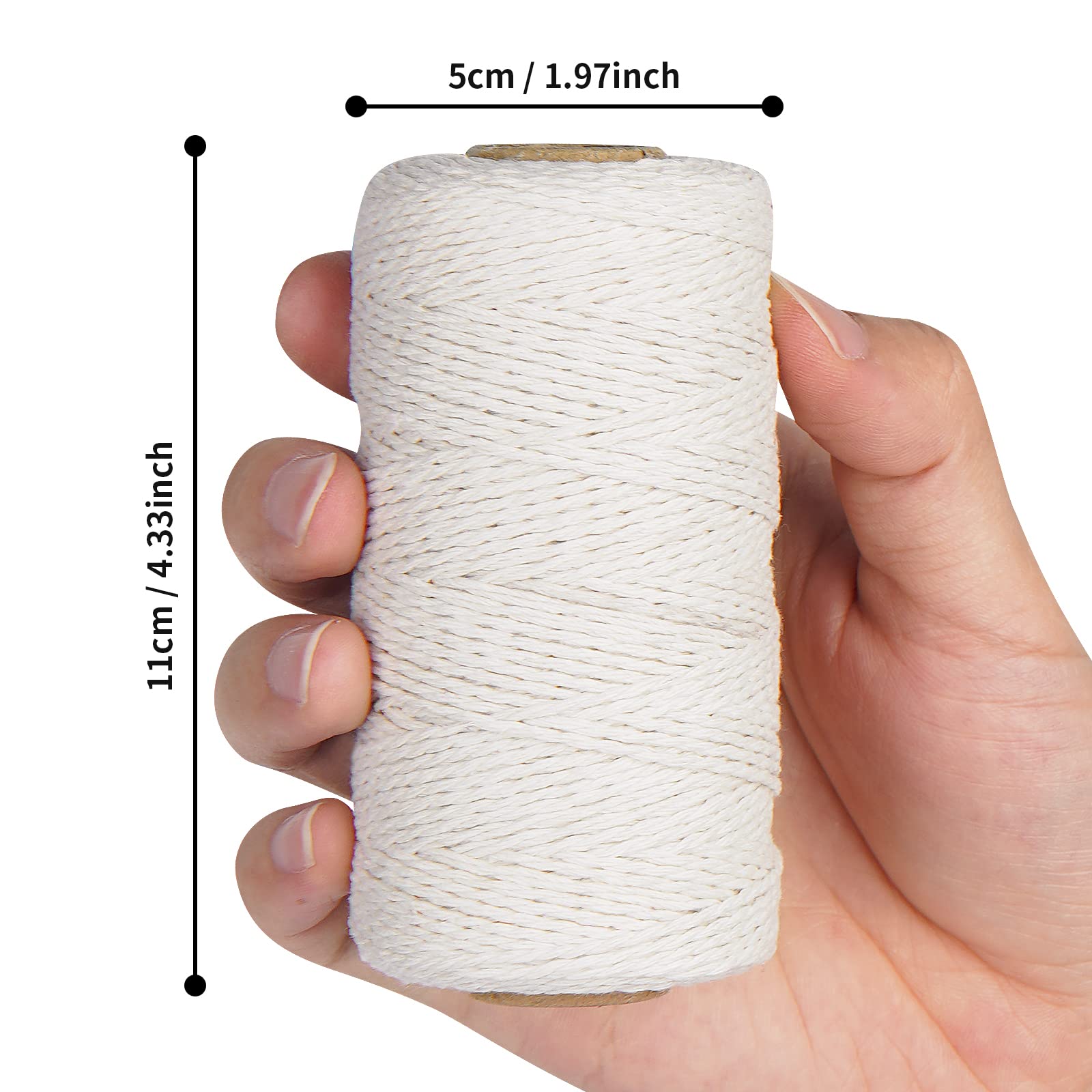 String diameter is approx 2mm and 328 feet in length.This thin bakers twine is long and strong enough for you to use in many occasions.This butchers twine is good as cooking twine and also good to tie meat and ensure the their shape, great for separating sausages or securing stuffing.This craft string can also be used for decorations, use the twine to wrap around glasses and favors for a wedding shower, decorate wine bottles.Please remind: The cooking string is safe for oven use. Keep away from flame when using for cooking as the the cotton material is flammable. -