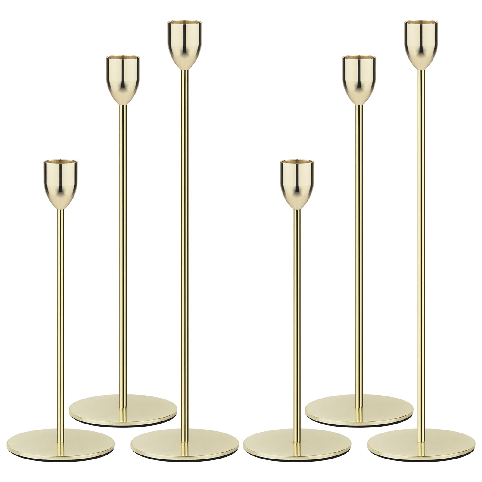 Elegant Taper Candle CupThis candlestick holder is crafted from high-quality aluminum alloy and possesses a substantial weight. Its surface has been meticulously polished and electroplated multiple times to ensure excellent corrosion resistance.Wide Stable Base, Slender and Elegant DesignFeaturing three varying heights, these candle holders provide visually distinct candlelight effects, creating a romantic and aristocratic ambiance. The wide and stable base allows them to be placed on a bookshelf, bedside table, or as a stunning centerpiece on a long farm table, interwoven with a garland of greenery for an enhanced aesthetic appeal.Non-Slip Velvet BottomThe EVA material bottom prevents scratches and sliding. The candle sticks holder decor is designed for easy disassembly, which makes cleaning and storage more convenient and extends its service life.TipsHow to Handle Candles Safely