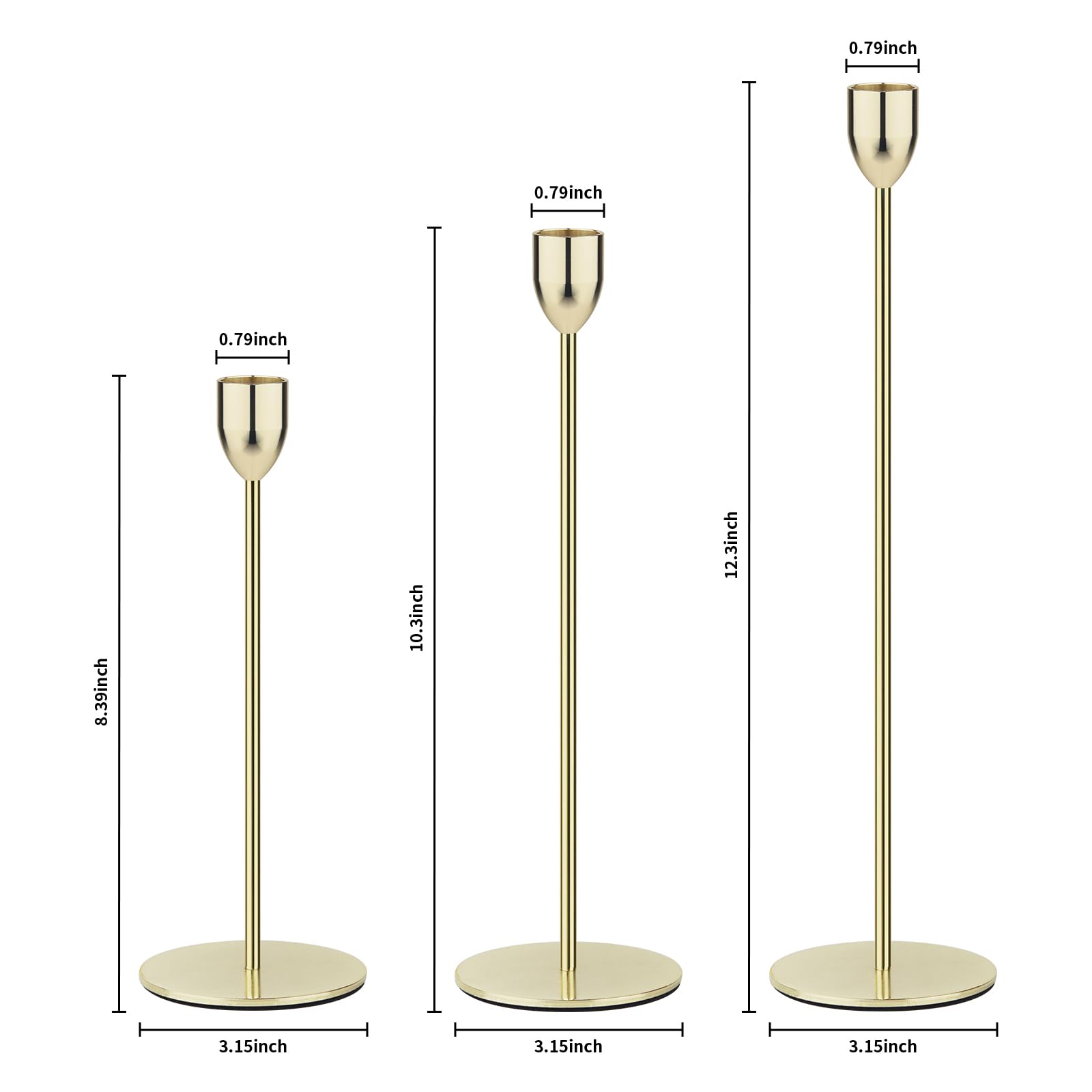 Suitable Size, Elegant Design - Sizes: S: 9.1" x 3.15", M: 11.1" x 3.15", L: 13.1" x 3.15" (H x W). The design of the candlesticks, reminiscent of red wine glasses, will protect your furniture when the candle drips. The bottom of the tall taper candle holders has non-slip velvet, which will prevent the metal base from damaging the surface of tables. The varying heights of these candlestick holders make them perfect for display.
