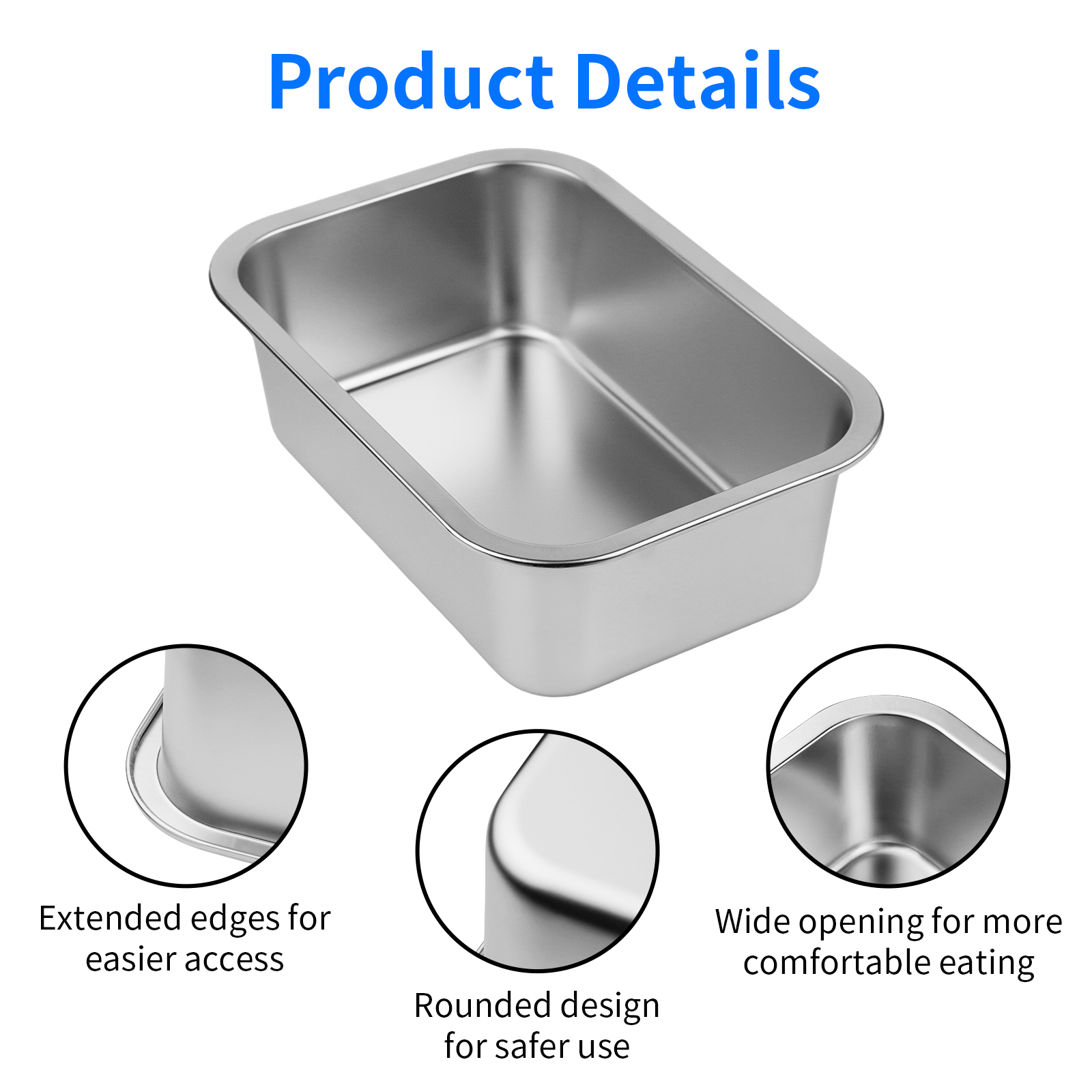 Ohtomber stainless steel water bowl for dogs is ideal for medium to large breeds!Quality Stainless Steel Pet BowlsOhtomber dog food bowls are made of high quality stainless steel with good rust and wear resistance. Even if it is exposed to water and food for a long time, it will not rust and corrode. The metal dog bowl is also able to withstand the biting force of large dogs and the wear and tear of daily use, and can also be kept in good condition after long-term use.Rectangular dog dishes with rounded edgesThe dog bowl adopts a widened rectangular structure, which makes it easier to fit the wall. It is very stable and not easy to be overturned by naughty dogs. The four corners of the outdoor dog water bowl are smooth and burr-free, making it more comfortable during use and effectively preventing cuts or scratches. It can also reduce the wear and tear on the edges, thus prolonging the service life of the dog water bowl.Large capacityThis bowl has a large capacity of 2.65 gallons, which can meet the water needed by dogs in time and ensure that dogs can always drink water when they are thirsty. Even when you are very busy, you don't have to pay attention to the dog's drinking water all the time. The no spilling large dog water bowl has a deep wall, which can effectively prevent water from splashing on the floor. It is also very suitable for families with multiple pets and can meet the dietary needs of multiple pets at one time.Easy to clean and Dishwater safeThe pet food bowl has a smooth surface without much cracks and textures, and food residue is not easily absorbed. You can easily keep the dog bowl clean just by washing it with water or wiping it with a damp cloth. The dog plates for food can also be washed in the dishwasher, which not only saves your time and energy, but also efficiently keeps the bowl clean and tidy.Multi-purpose pet water dishSuitable for all types of food:The dog bowl is made of heat-resistant stainless steel and can hold a variety of foods, such as water, milk, dry dog food, wet dog food, canned pet food, refrigerated fresh pet dog food, homemade dog food, etc.Suitable for different types of pets:dogs, cats, rabbits, giant tortoises, Sulcata, pet duck, ferrets, Guinea pigs, etc.Suitable for different scenes:indoor, outdoor, camping, multi-pet family, etc., and can also be used as a resting place for small pets by laying down a soft mat, as a bathroom for small birds or giant turtles, etc.Tip:It is recommended to rinse directly with warm water or clean with mild detergents, and avoid using acidic detergents. Please wipe dry for storage when not in use. -