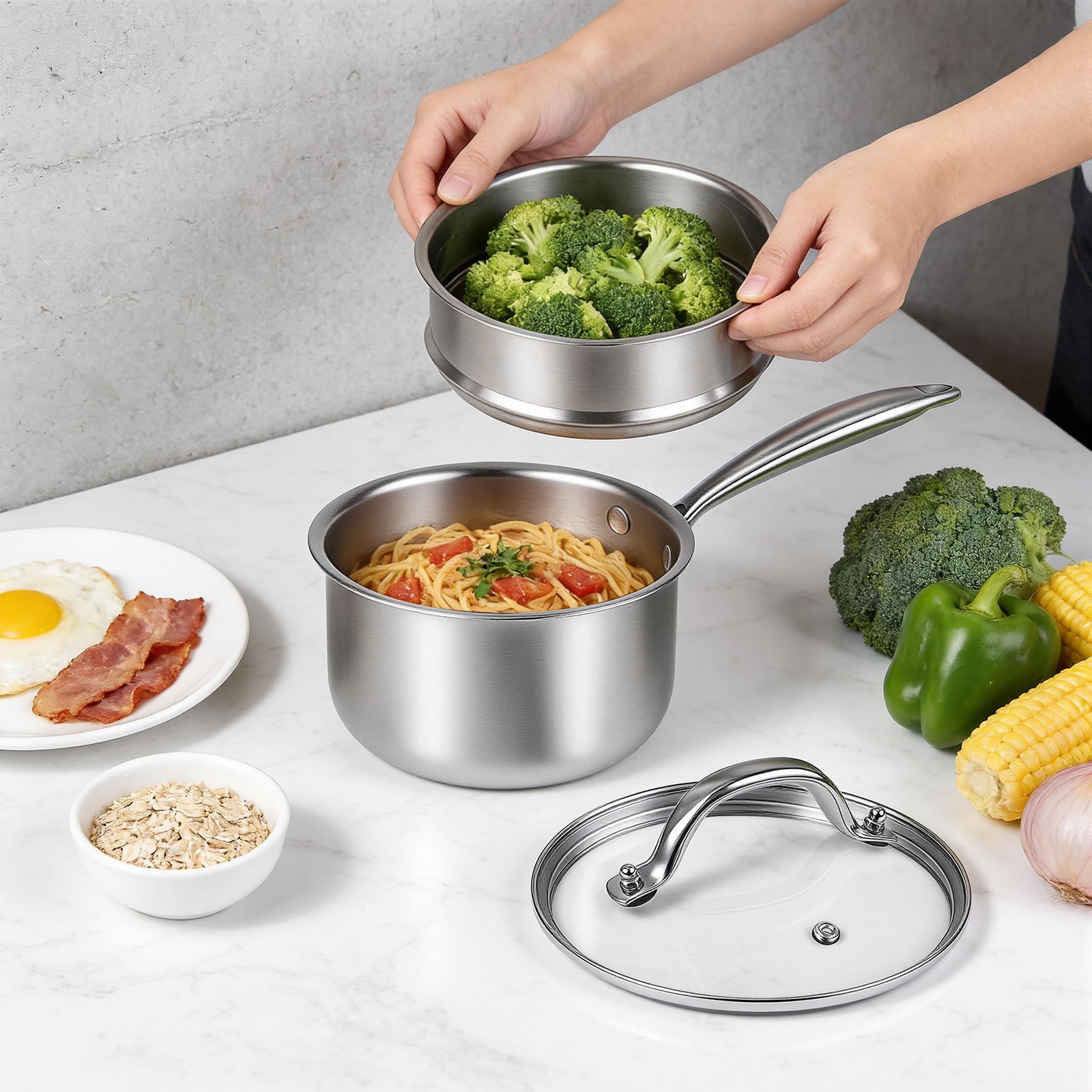 Useful Sauce Pan with Steamer BasketThis useful saucepan with lid is perfect for steaming vegetables, cooking rice simultaneously, and reheating leftovers. Compared to larger stock pot, this steamer pot saves energy while heating food. The cooking pot’s tri-ply thick bottom design prevents hot spots, ensuring even cooking and enhanced energy efficiency.Good Heat DistributionThe thick bottom of this steamer pot ensures even temperature distribution, allowing for quick heating so you can enjoy perfectly cooked meals every time. It is ideal for slow cooking, pasta, soups, and more. Simply heat the sauce pan gradually without placing it directly on a preheated burner. The small sauce pan is non-stick, distributes heat evenly, and cleanup is a breeze.Multipurpose PotThis versatile pot is perfect for making soups, oatmeal, baby food instant noodles, steaming tamales, veggies, broccoli, couscous, pasta and dumplings, crab legs, shrimp and other sea food . It's ideal for use in homes, dormitories, RV and various other settings. Whether you need a stew pot or a small pot for boiling water, this pot meets all your cooking needs.Ventilation hole and tight-fit lidThe exhaust vent on the lid of the stainless steel cooking pot is designed to retain heat and moisture, thereby enhancing the flavors of your dishes. This ventilation hole effectively releases excess steam and heat from the vegetable steamer, minimizing the risk of boil-overs and spills. Additionally, the lid of the steamer pot and steamer basket fits tightly and prevents leaks at the sides.Stay-Cool and Easy to Store HandleThe solid riveted handle of the sauce pan is quite long, not easy to break, making it comfortable to grip and easy to lift due to its weight-saving design. Additionally, the large hole at the end of the handle is perfect for hanging storage.Smooth EdgeThe smooth edges of both the cooking pot and steamer basket eliminate any sharp areas or hard-to-reach corners, making the pasta pot safe to handle and easy to clean. The scratch-resistant, non-coated (NO PFOA) design ensures that the saucepan remains free from harmful chemicals and coatings, providing a safe cooking environment for you and your family. -